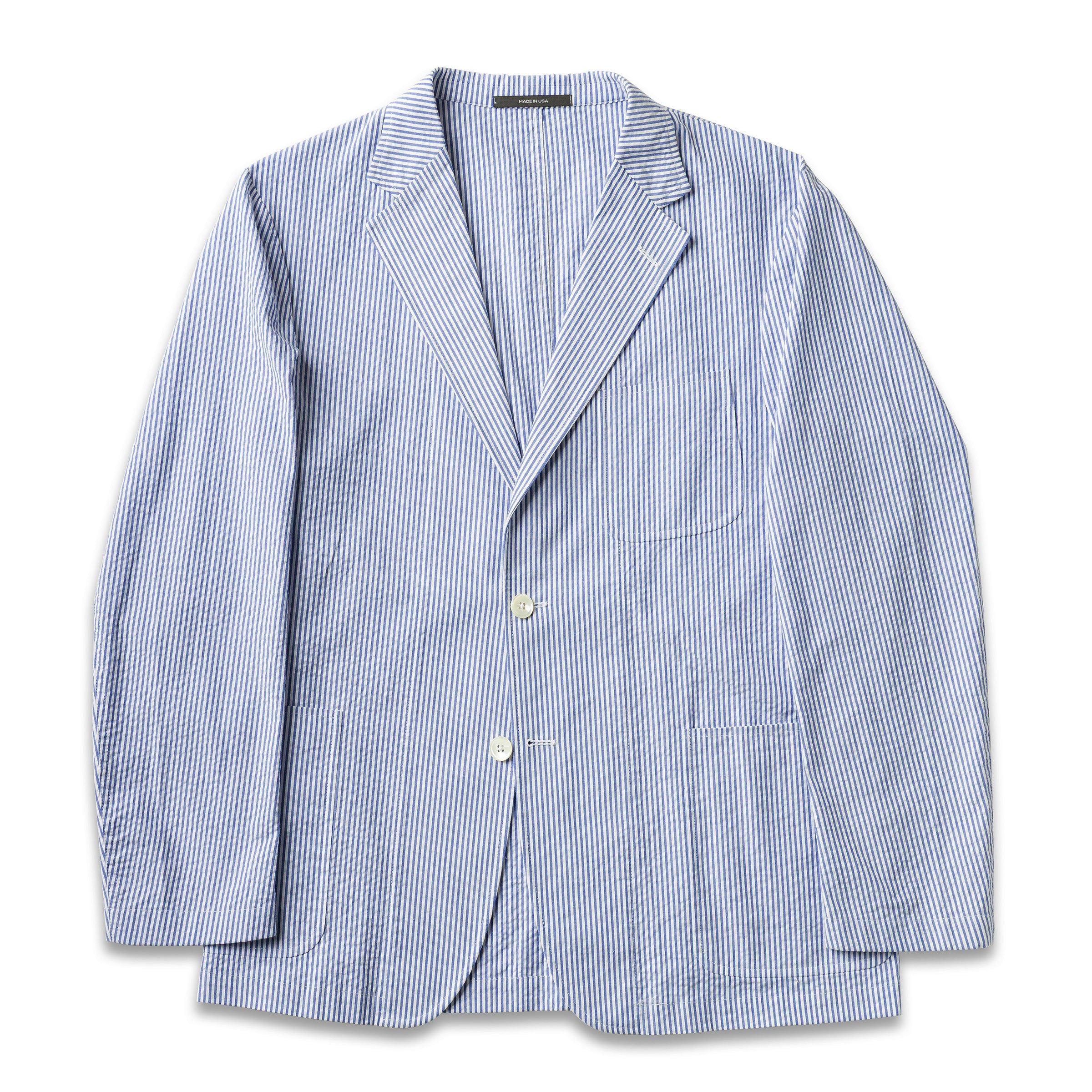 Robust yet supple, this Japanese-woven seersucker fabric is a luxurious step up from our shirting seersuckers. Woven with a more heft and body, the structure in this fabric produces fantastic shape for the jacket. But like any seersucker, its distinct pucker texture raises the fabric away from the skin and increases surface area, both of which encourage breathability, wick moisture, and keep you cooler. Cream and navy stripes add a vintaged quality that we feel is particularly suiting for our Simple Jacket.