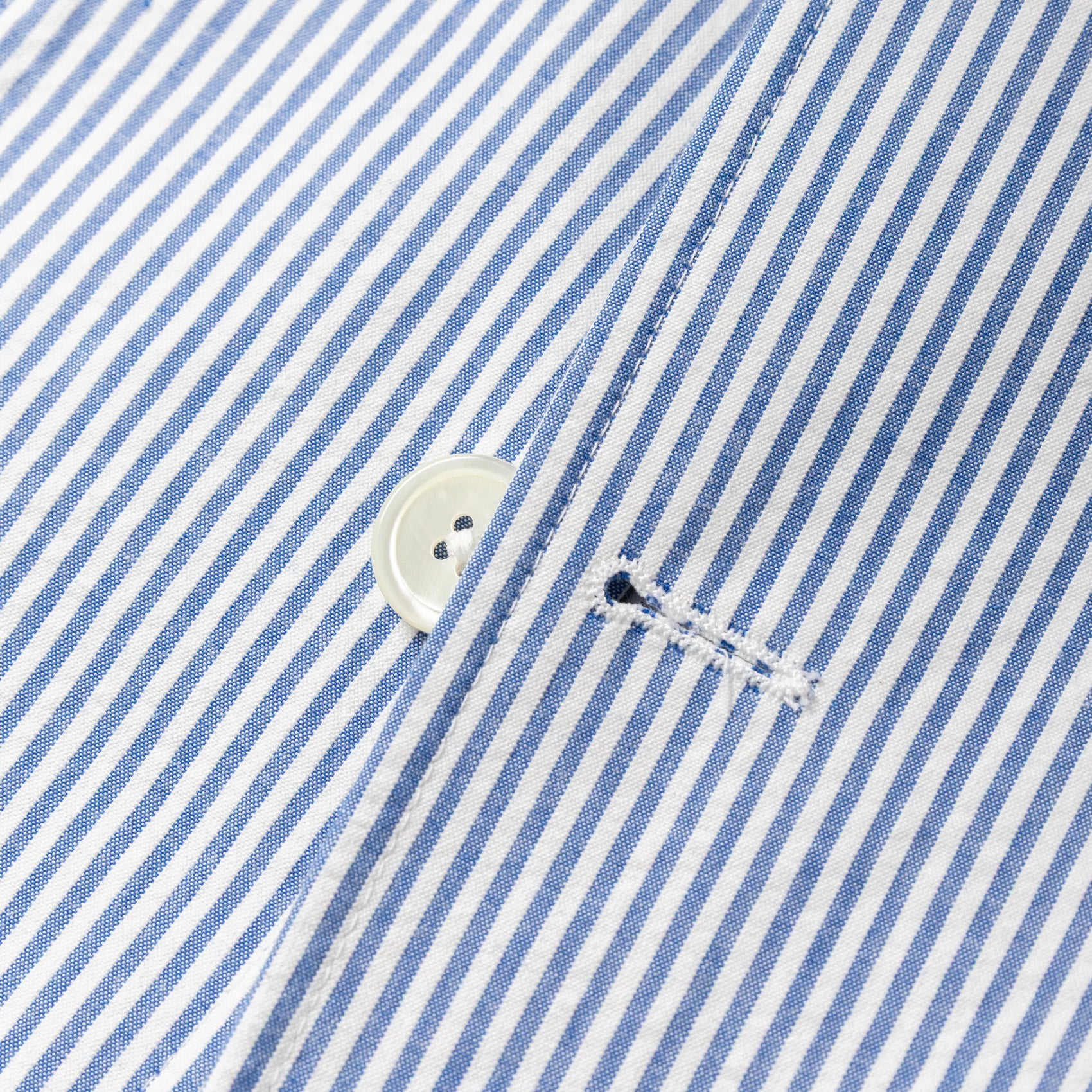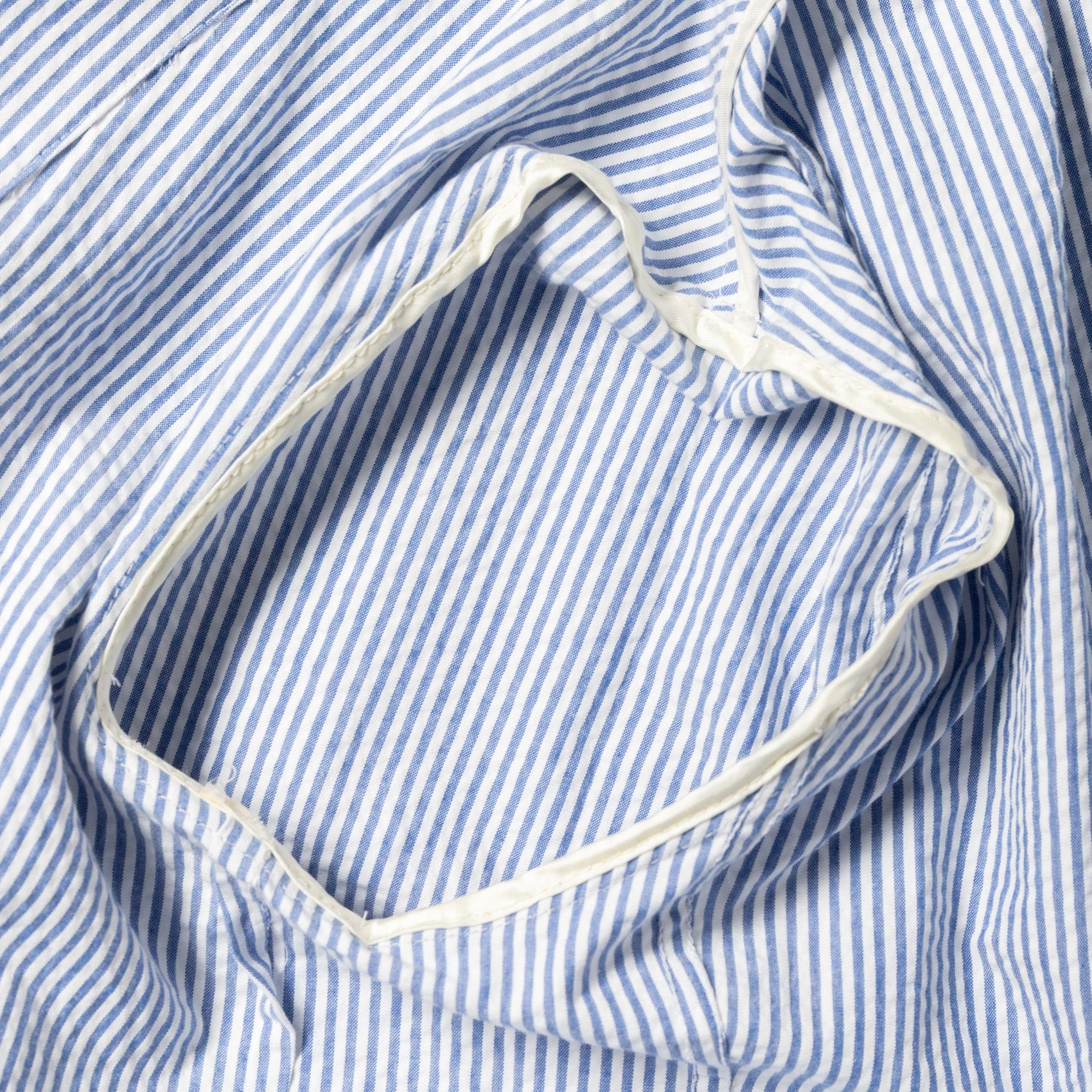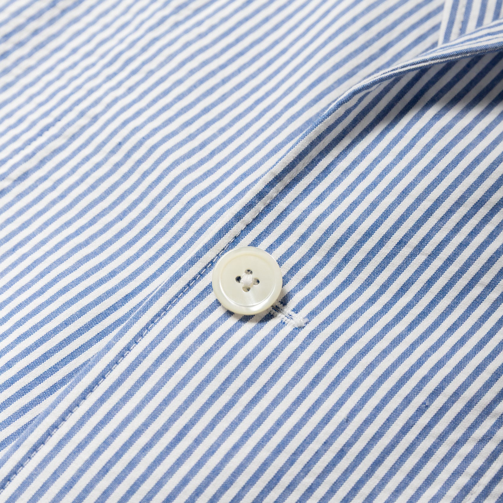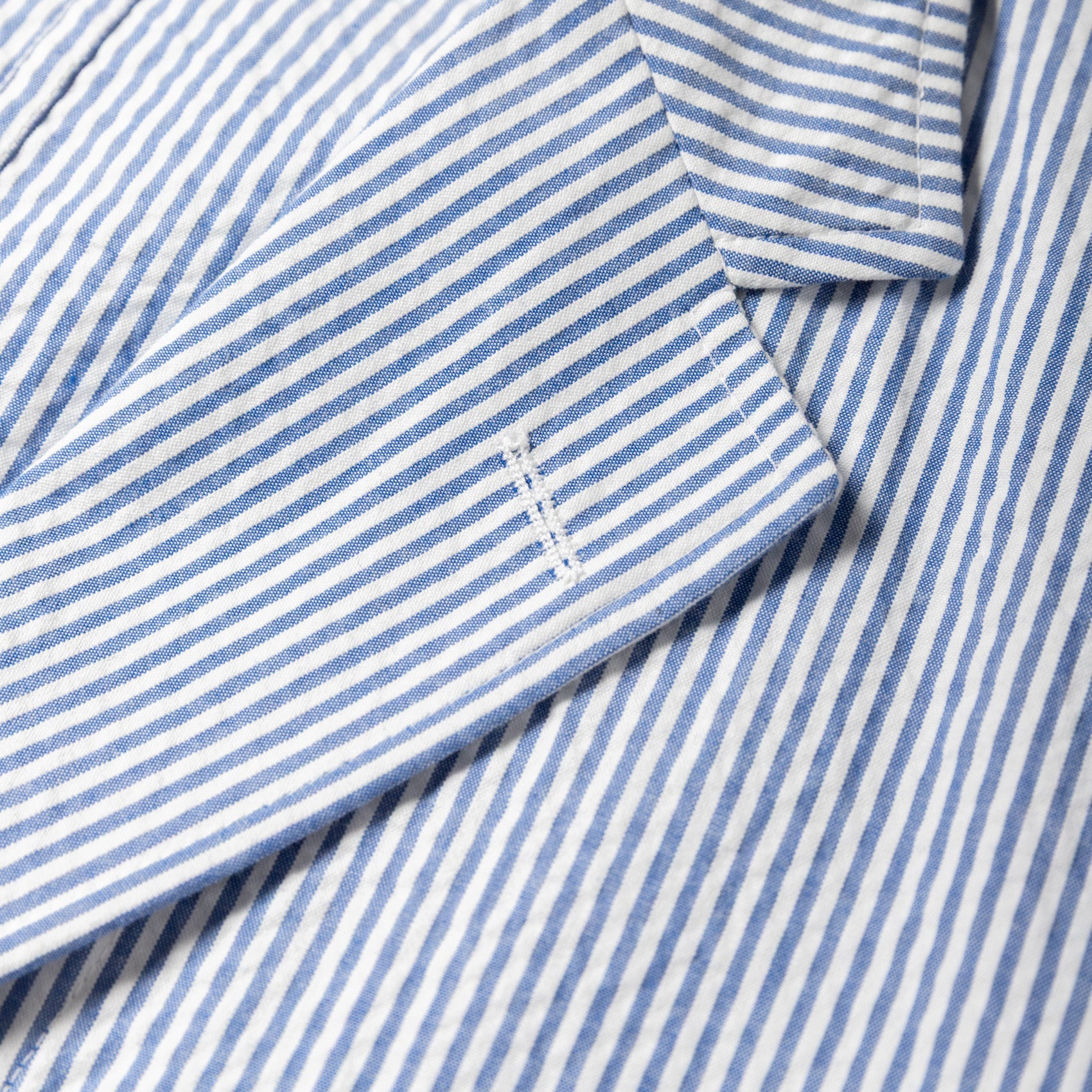 For SS26, we've opted for a Japanese-woven blue and white striped seersucker, a fabric long associated with warm-weather dressing. Woven with a subtle puckered texture, seersucker offers active cooling by lifting gently away from the skin, allowing air to circulate. A bit of form and a lot of function.