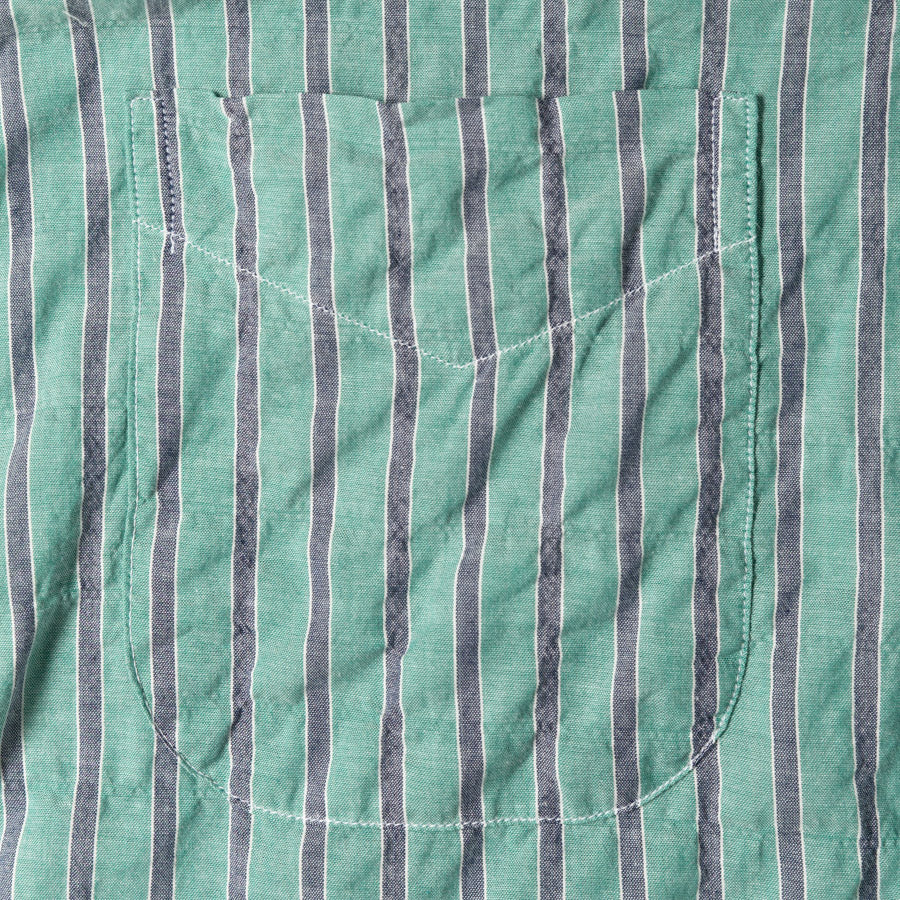 We've worked with countless awning stripe fabrics over the years, but none have been quite like this. Woven with a featherweight 2.7oz hand, this is our most breathable interpretation by far. Plus, with variation in yarn tension throughout the fabric, a subtle grid pattern emerges as a cheeky reference to seersucker. All in, we can already tell this will be our go-to for beach days and strolls down the boardwalk.