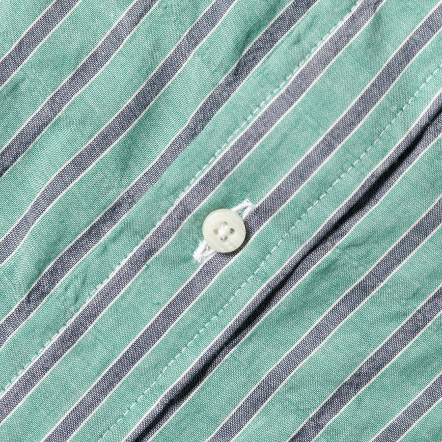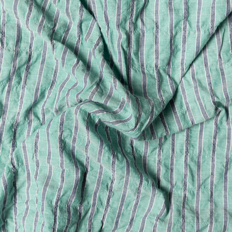 Awning stripe fabrics recall the slow, laid back pace of coastal Mediterranean towns and the distinctly colorful awnings that line their streets. Crafted as references, not exact replicas, our SS26 awning stripe fabrics nod to these scenes while maintaining wearability for the everyday. This seafoam green colorway embraces that perspective with a quintessentially Japanese twist: nuanced color tonality and variable yarn tension.