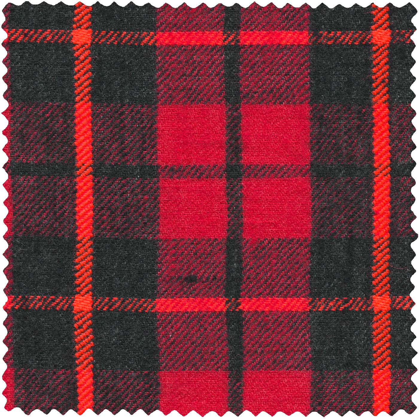 The red and black base cloth features slubbed yarns, a two-step brushing process for softness, and tartan's quintessential 2x2 weave construction.