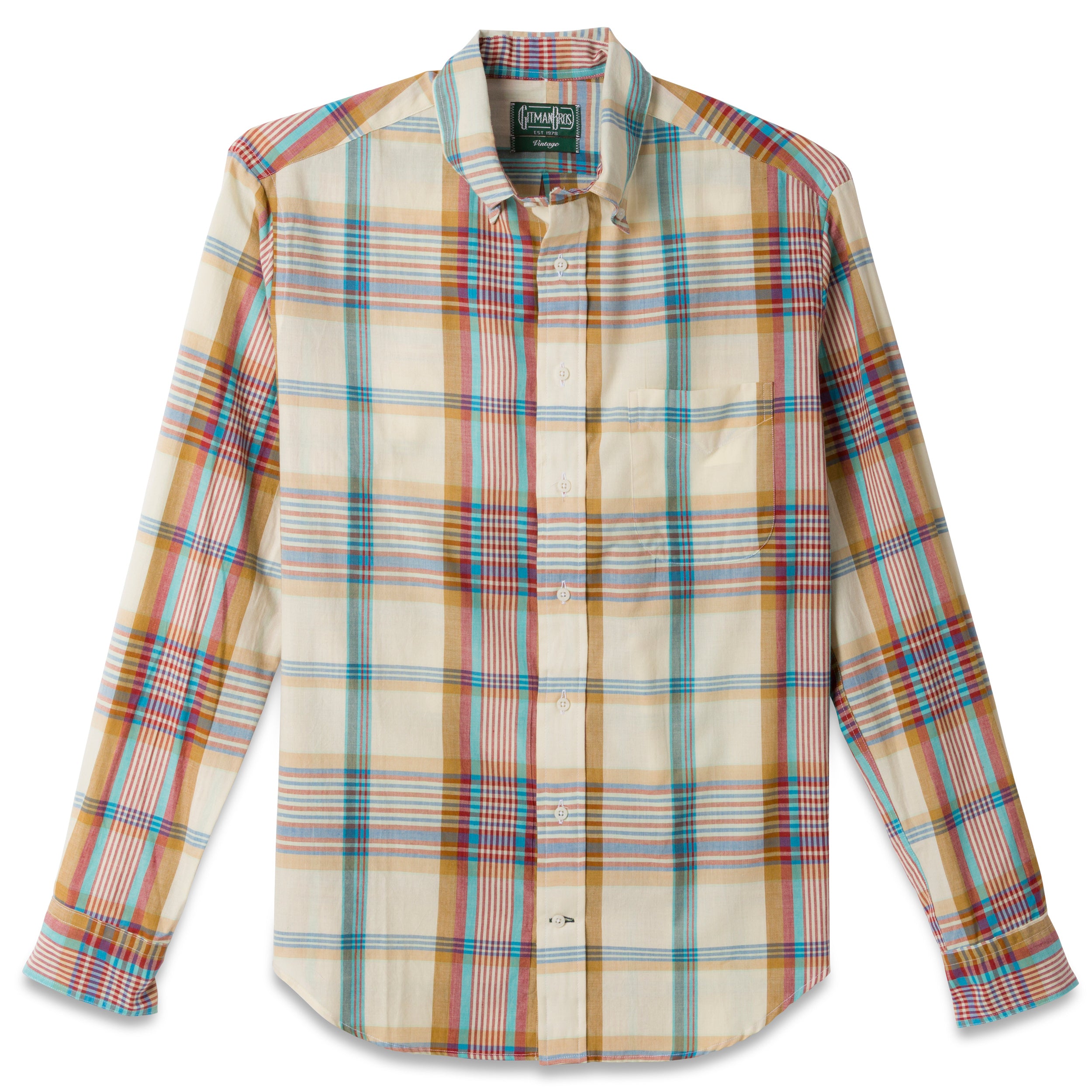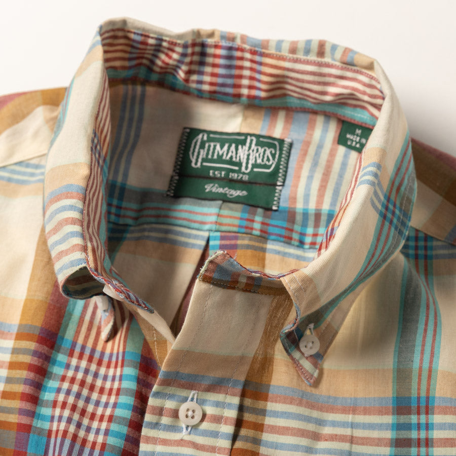 A Gitman Vintage spring/summer collection is never complete without Madras drawn from our own archives. This tan colorway first appeared in the Gitman Bros. line in the mid-1980's, and carries with it a distinctly vibrant palette of tans, reds, and blues.
