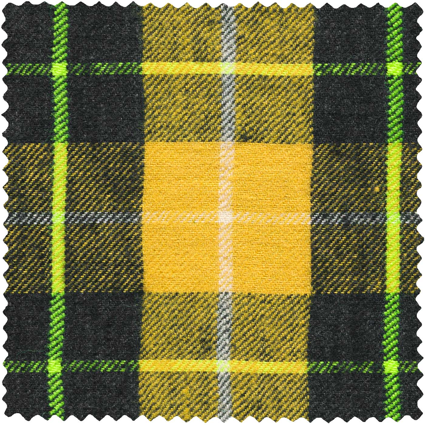 The yellow and black base cloth features slubbed yarns, a two-step brushing process for softness, and tartan's quintessential 2x2 weave construction.